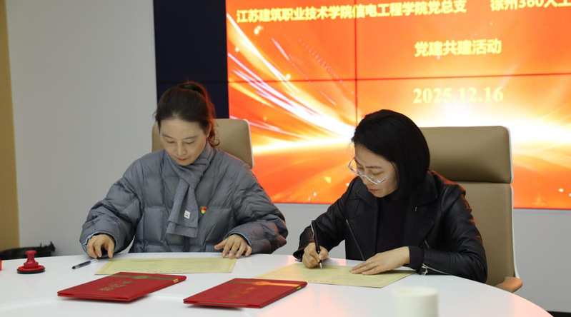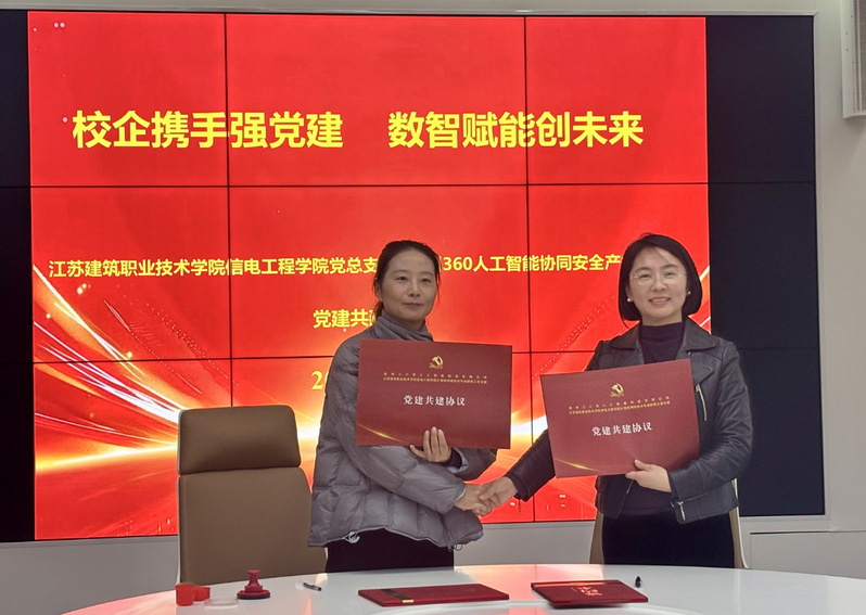 在随后举行的共建仪式上,泉山区金山街道党工委副书记、珠山数字经济工作专班成员孟子旭介绍了园区发展及党组织建设情况。江苏建筑职业技术学院信电工程学院院长吴兆立介绍了学院在人才培养、专业建设等方面的成果,党总支书记虞莉则重点分享了学院“党建+业务”双融双促的工作机制与特色做法。共建环节中,信电工程学院计算机网络技术专业群教工党支部与徐州360人工智能协同安全产业基地现场签署党建共建协议。双方将以协议为纽带,围绕组织共建、人才共育、技术共研、发展共赢等方面开展深度合作,推动党建与业务同频共振。