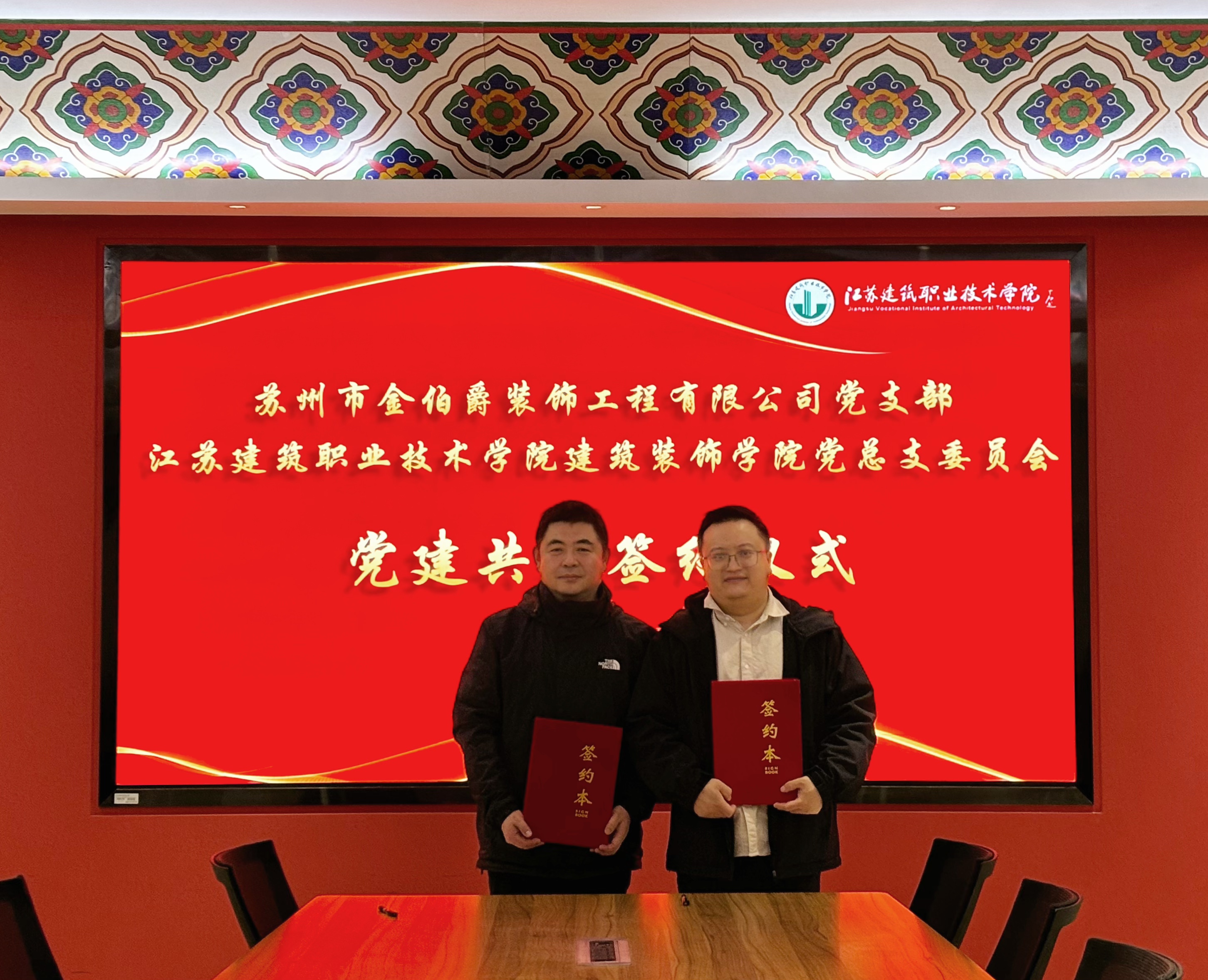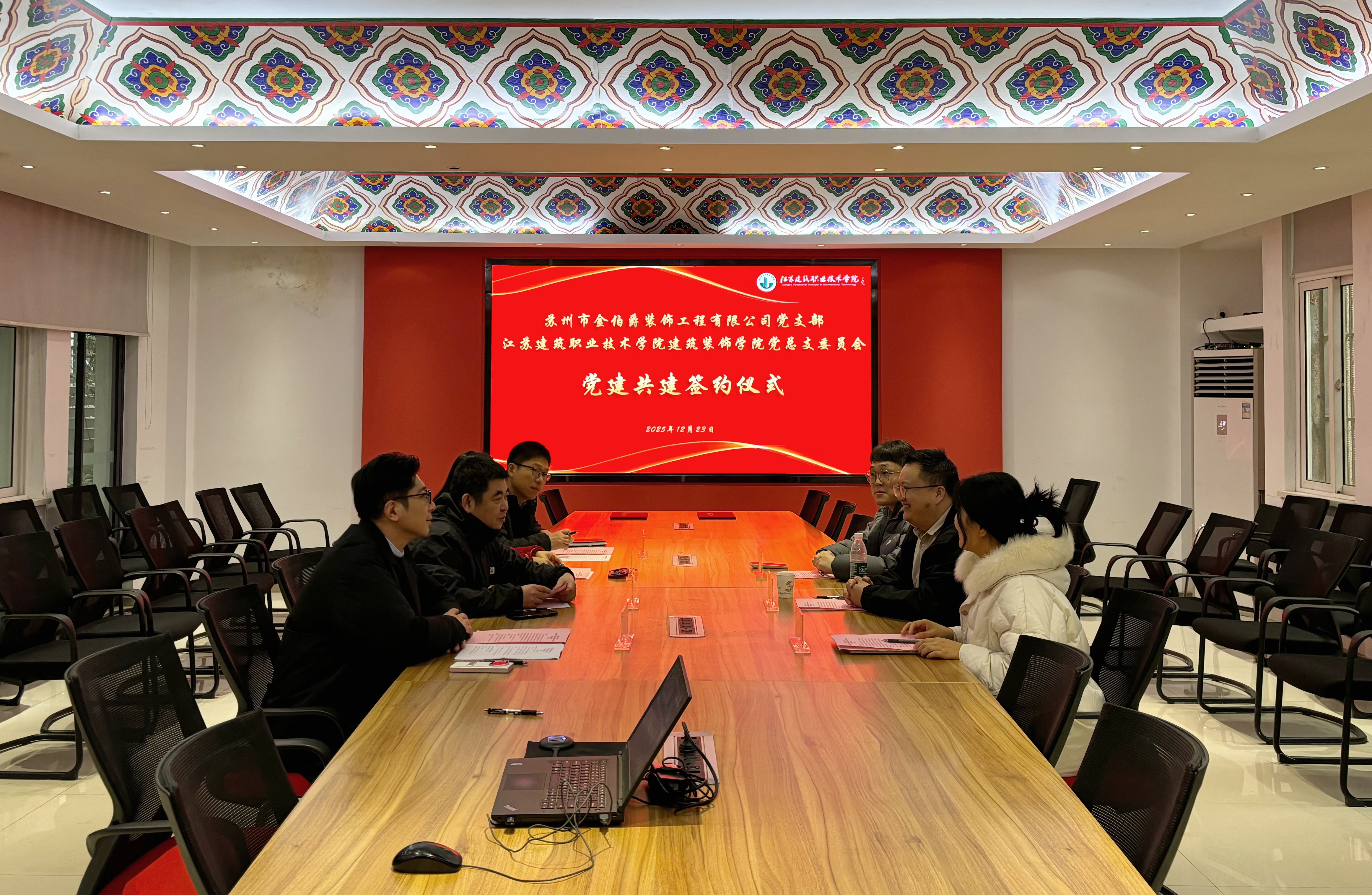 12月23日下午,建筑装饰学院党总支与苏州市金伯爵装饰工程有限公司党建共建签约仪式在建筑装饰学院会议室举行。双方以“党建引领·发展共谋”为主题,签署《党建共建合作协议》,标志着校企党组织合作迈入新阶段,共同开启以高质量党建引领事业融合发展的重要篇章。